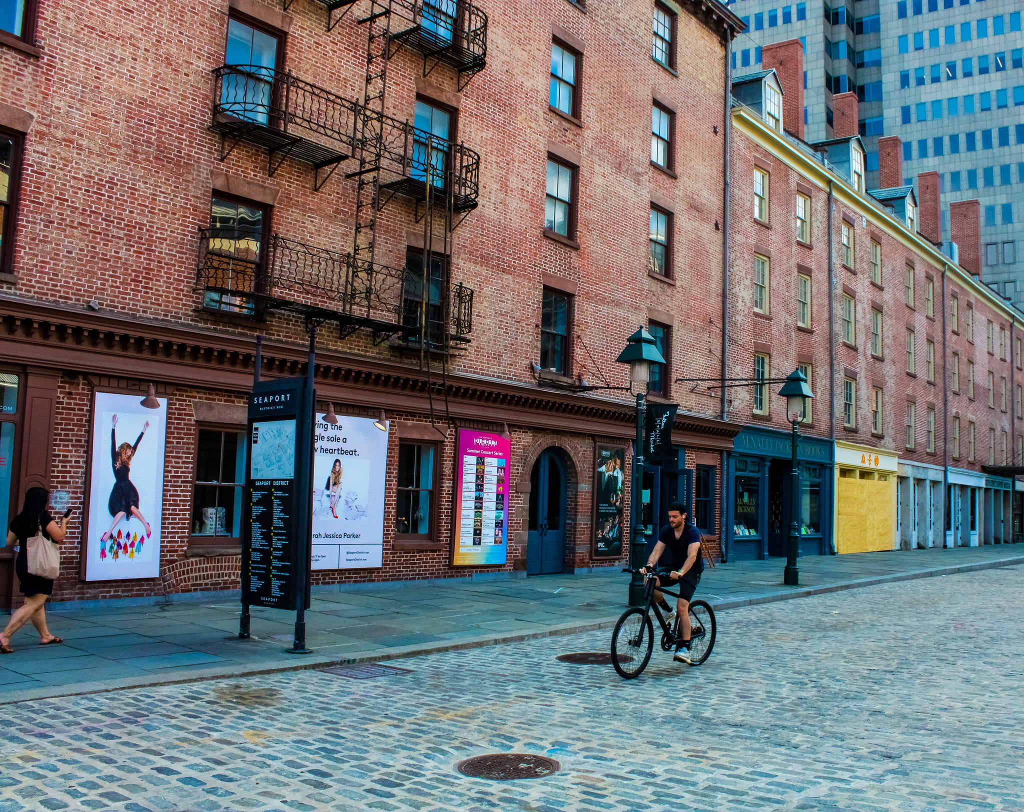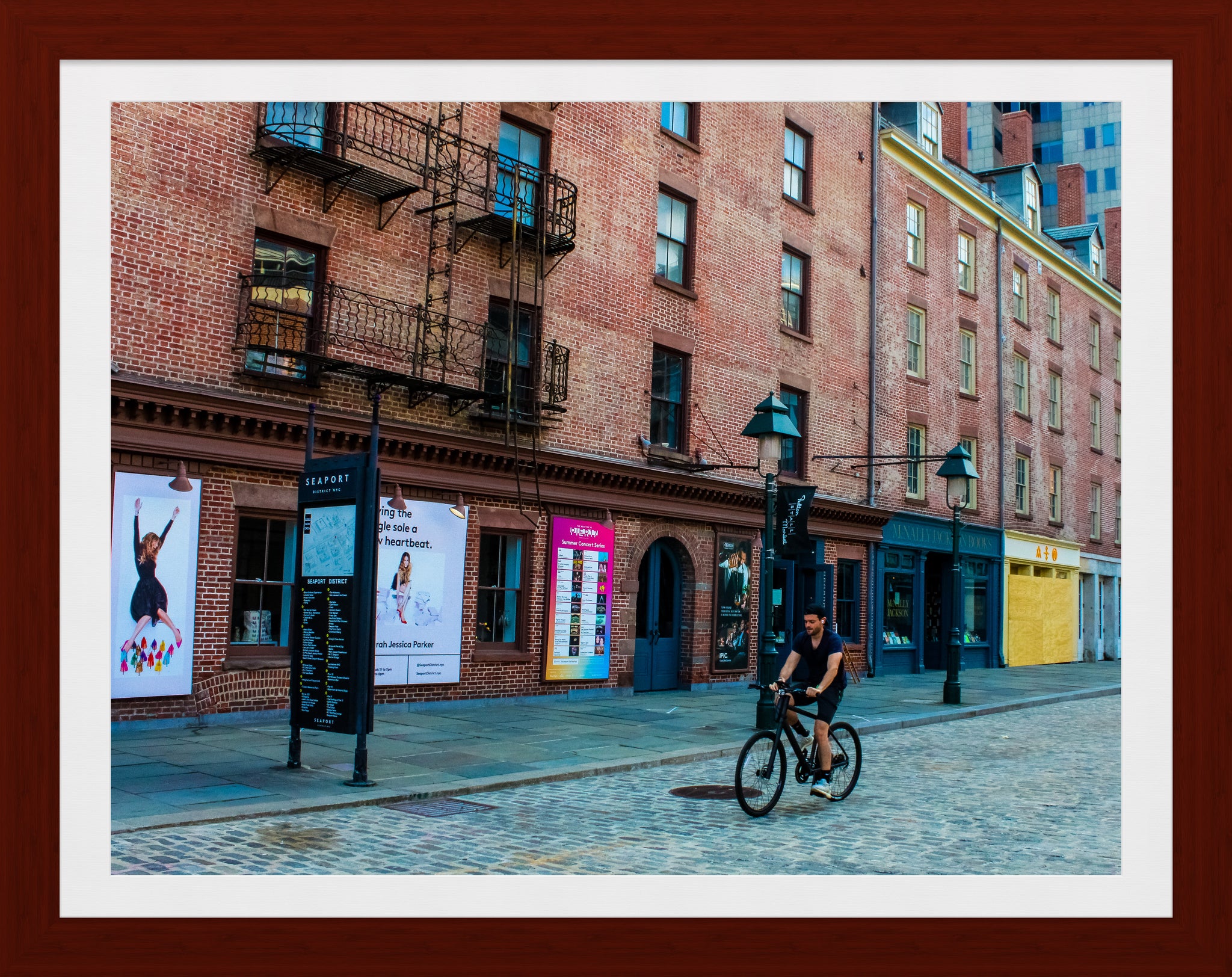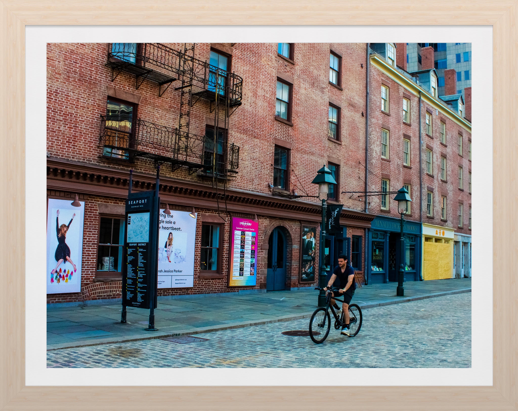 This was taken by the South Street Seaport where there are many older buildings and streets of cobblestone. I feel the cyclist gave this picture lots of character. Guaranteed to be a nice addition to any room in your home or office.