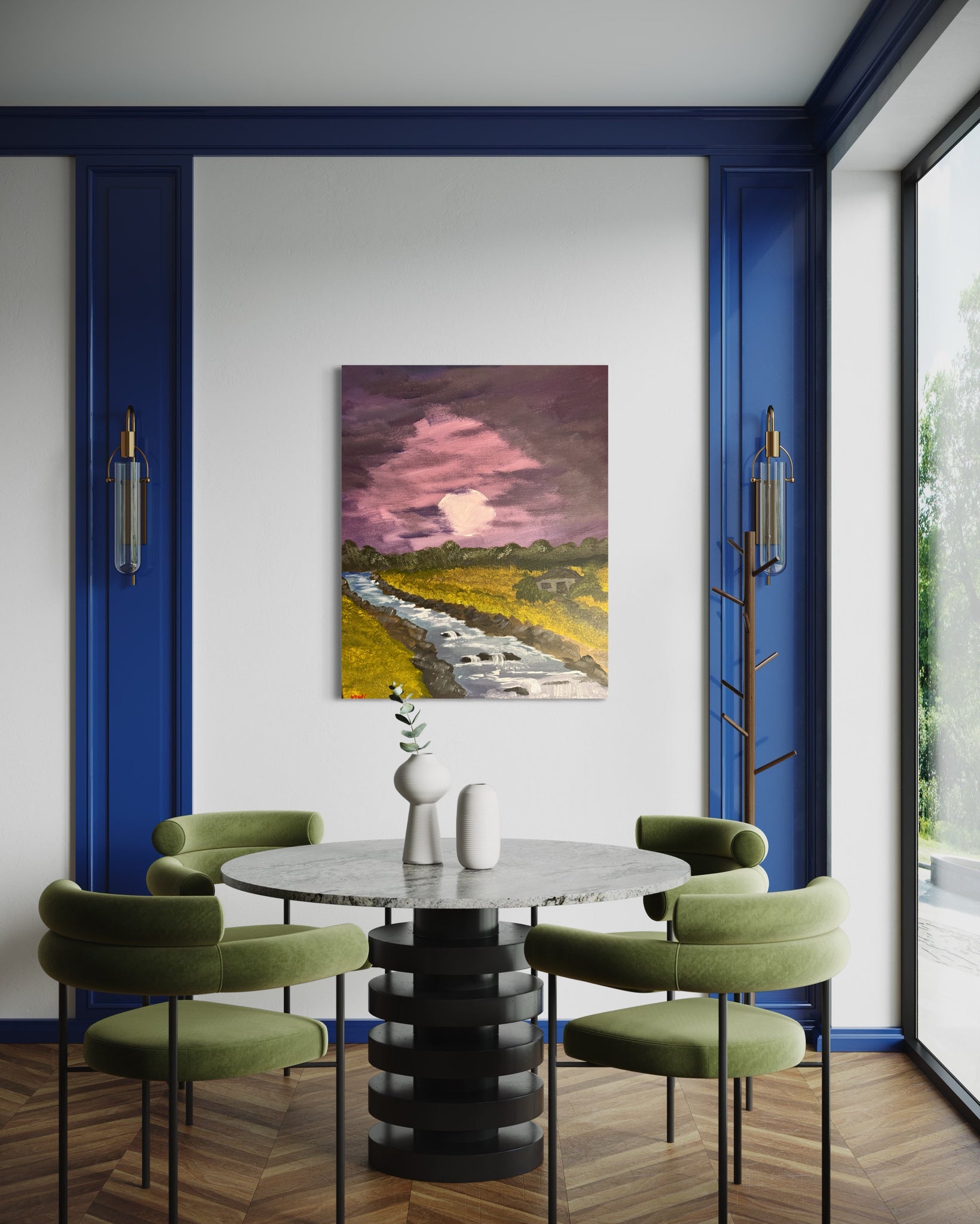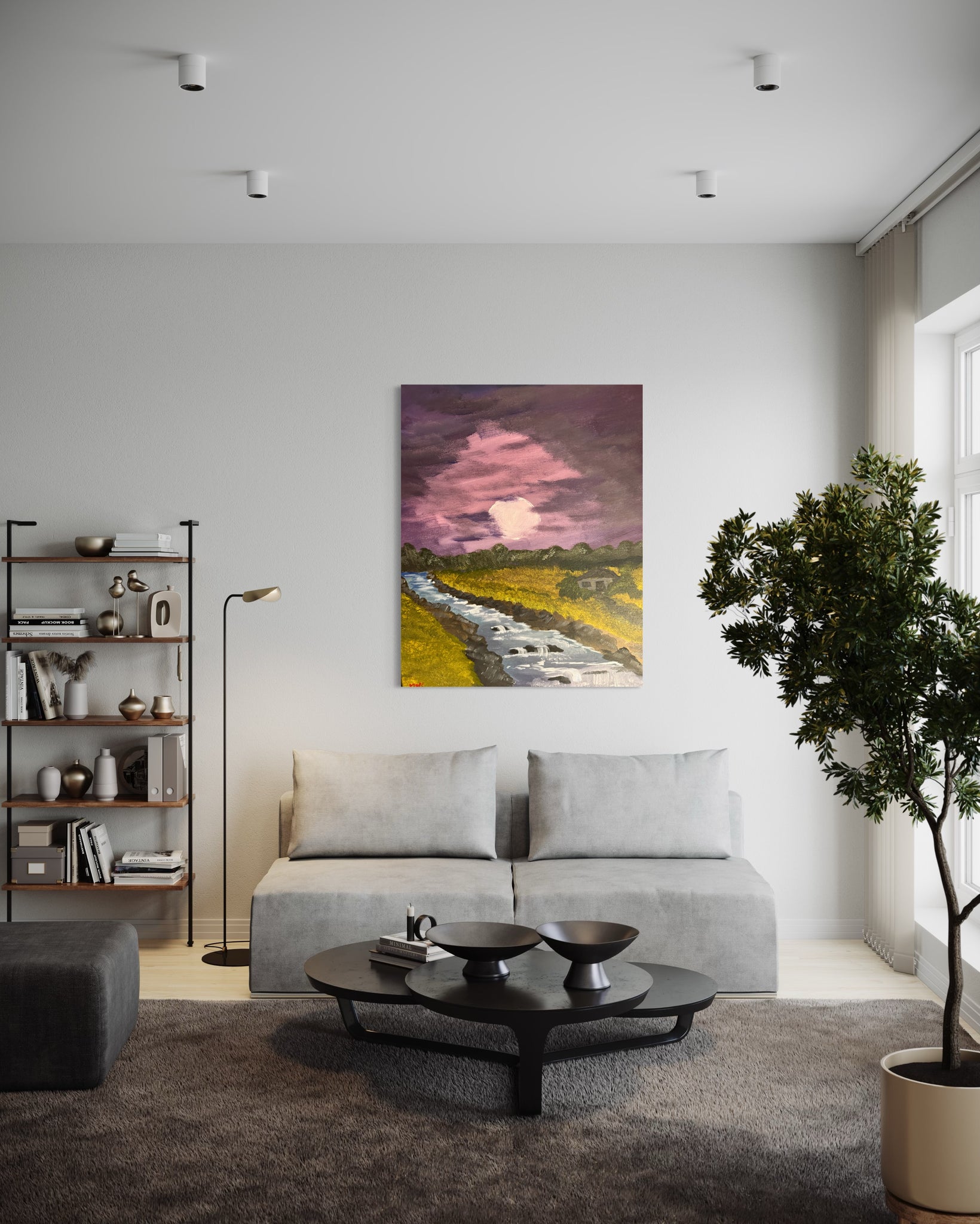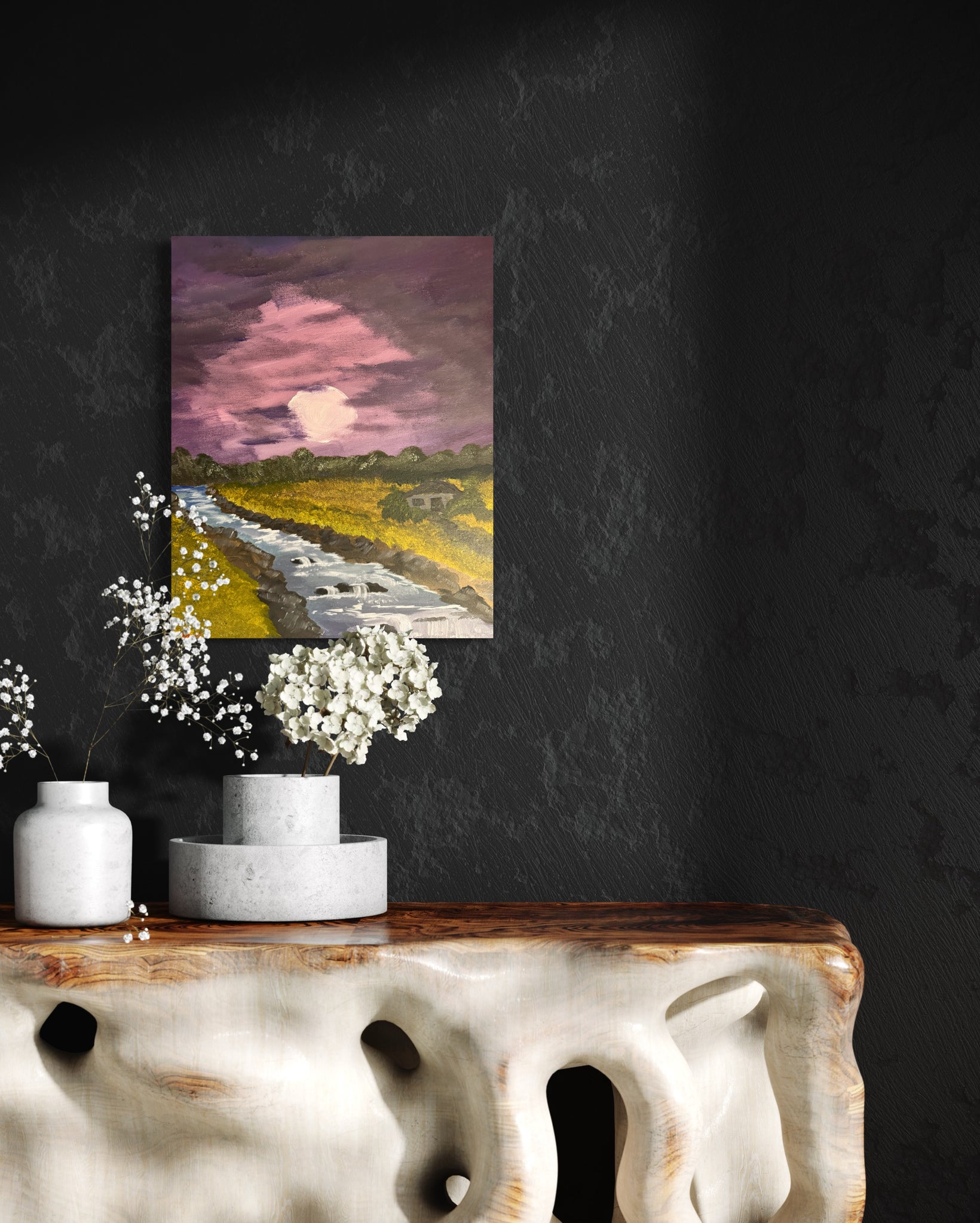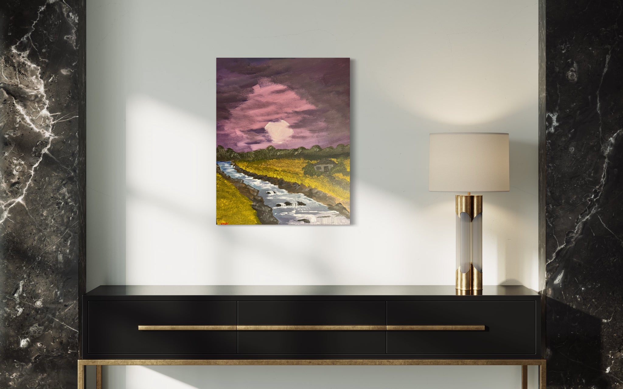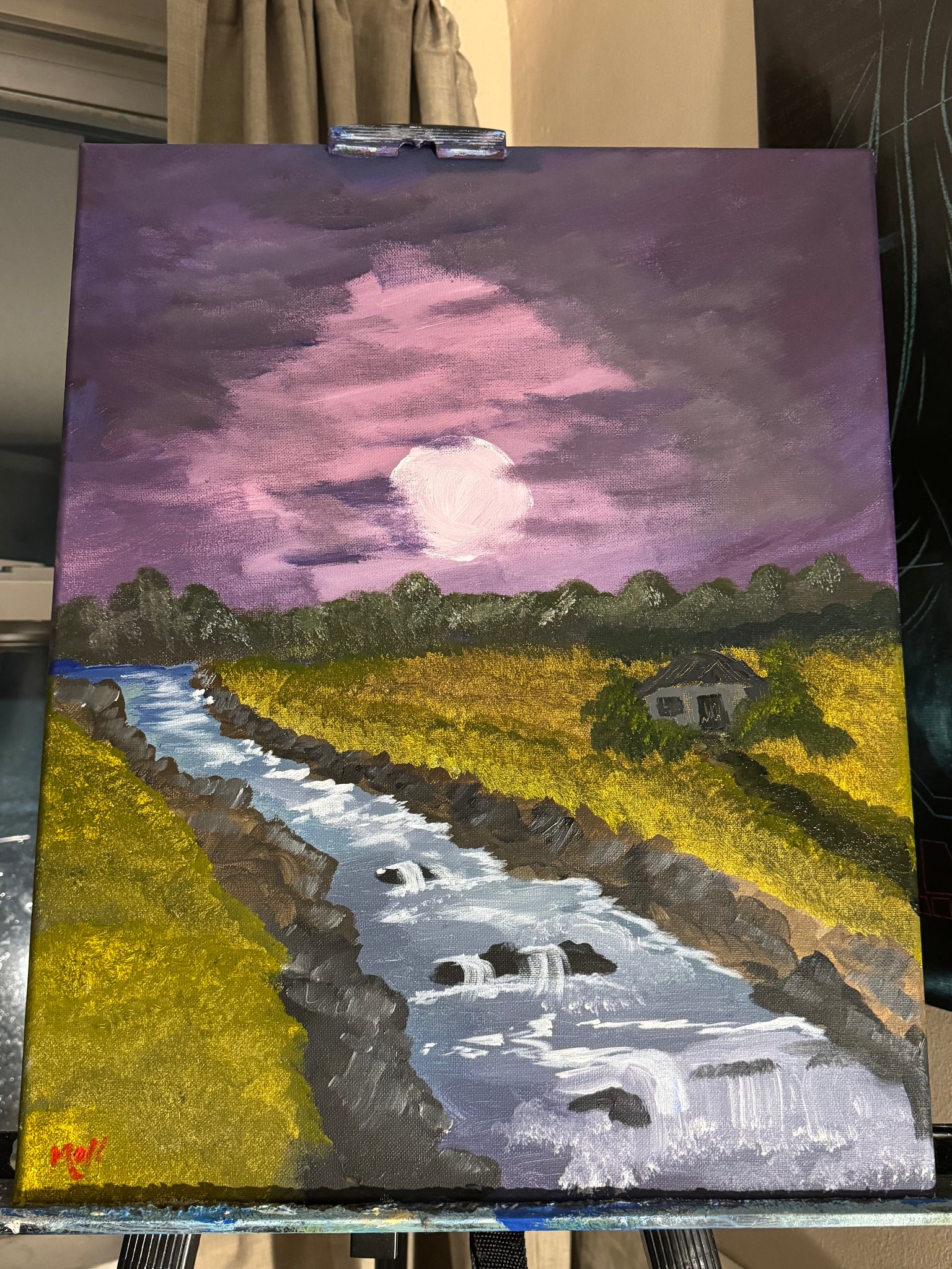 A Bob Ross inspired I painted recently. It is painted with acrylic paints on a 16" x 20" stretched canvas. It's just a cottage that has been deserted for some time by a bubbling river with a waterfall. It is a beautiful painting for any room in your home. It is signed by be artist.