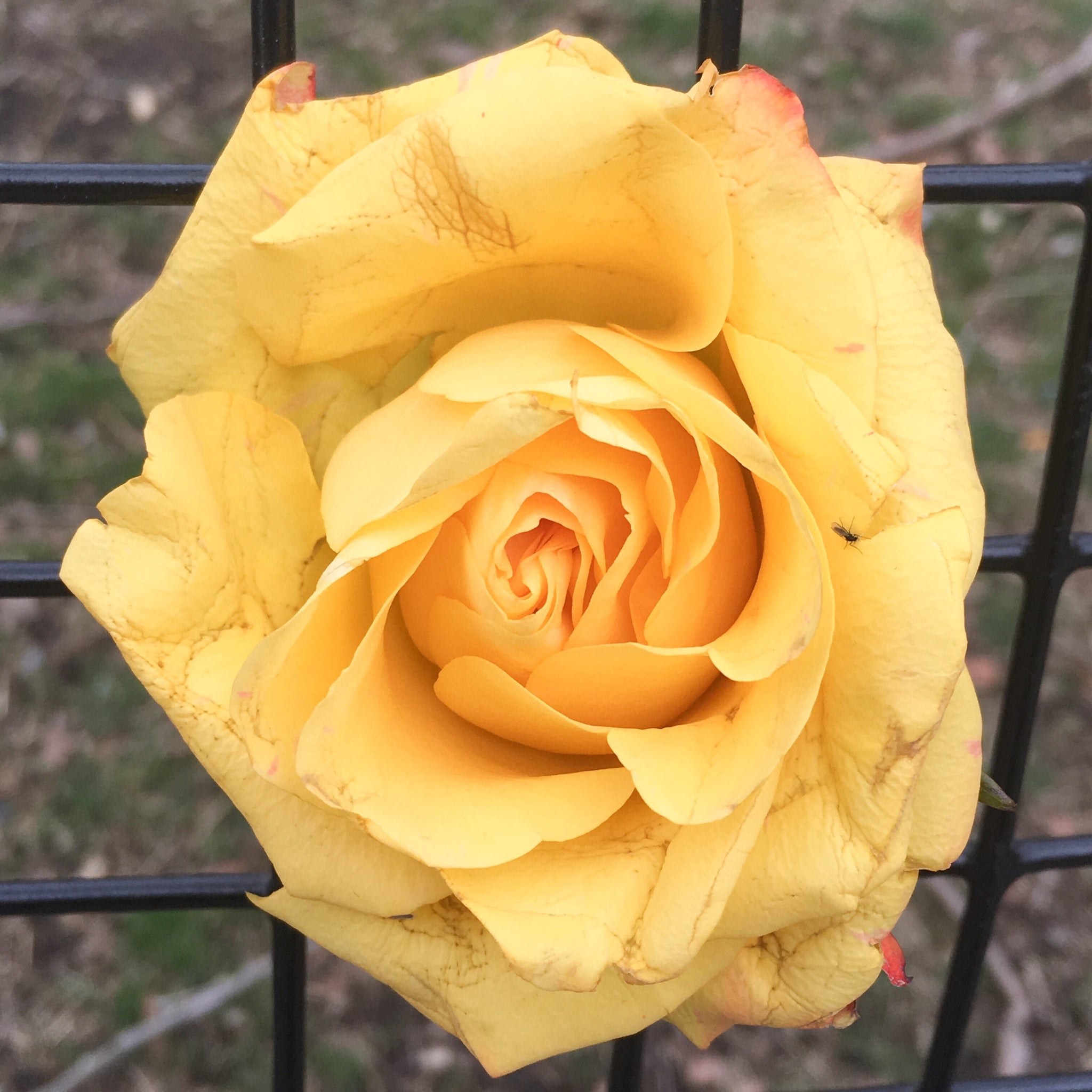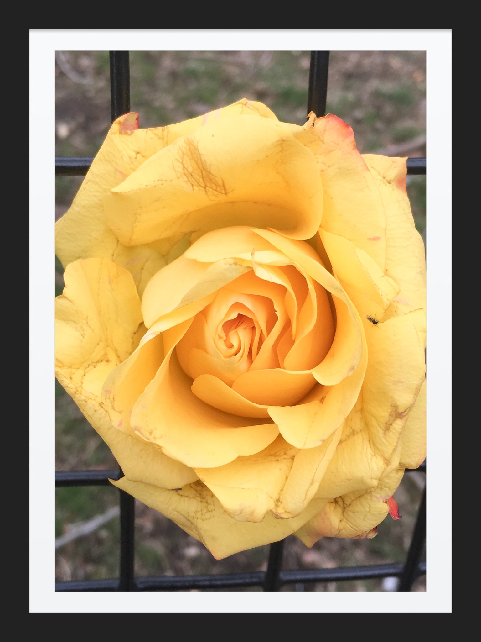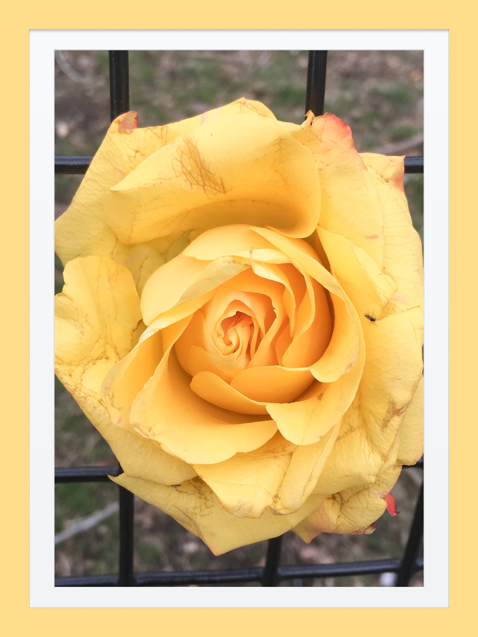Great detail on this yellow rose stuck on a fence. Great piece to hang in your living room, kitchen, pretty much anywhere.